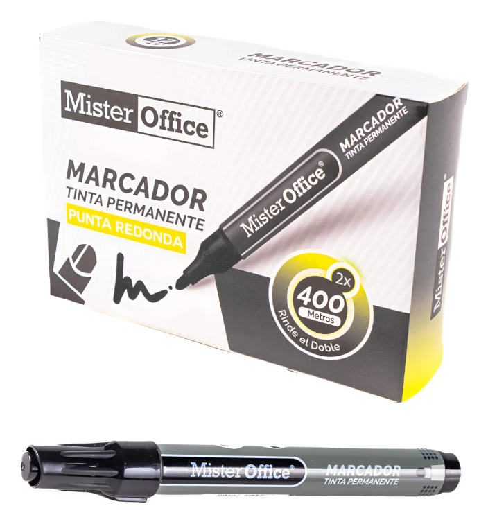 Marcador Permanente Plumón 12 Unidades Mister Office Punta Redonda Negro Negro - Punta Redonda